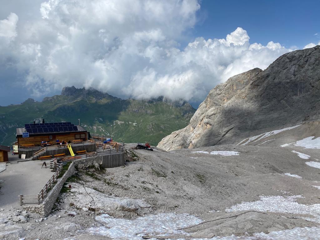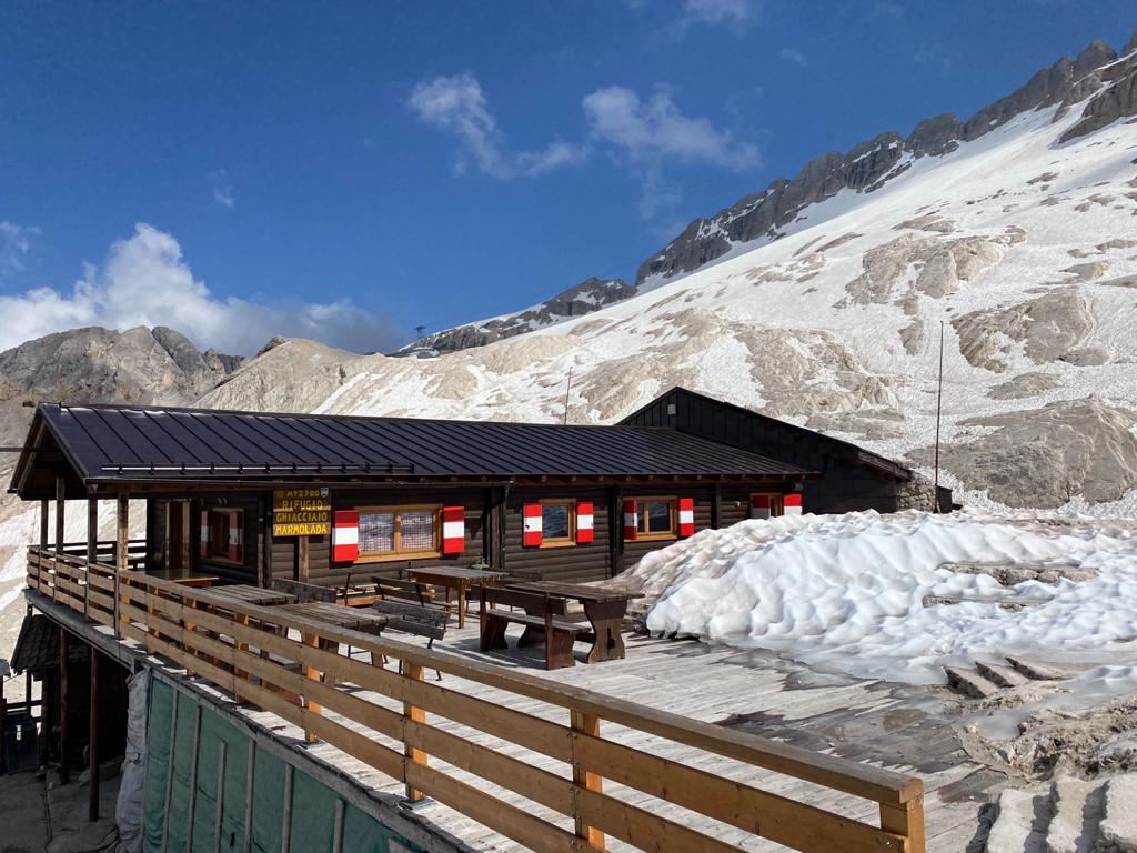 Ultimo sforzo ed ecco finalmente il rifugio, costruito 70 anni fa, da sempre punto d’appoggio per gli escursionisti in Marmolada, gestito da nove anni da Guido Trevisan assieme a Davide, Stefano e Sirio.