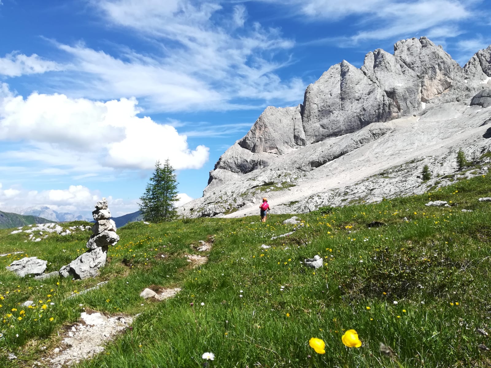 Si parte da Passo Fedaia, a poco più di 2000 metri di altitudine, al confine tra la Val di Fassa e il Veneto. Proprio di fronte al Rifugio Cima Undici si segue la traccia segnata da queste costruzioni tradizionali con i sassi posizionati uno sopra l’altro a mo’ di torre.