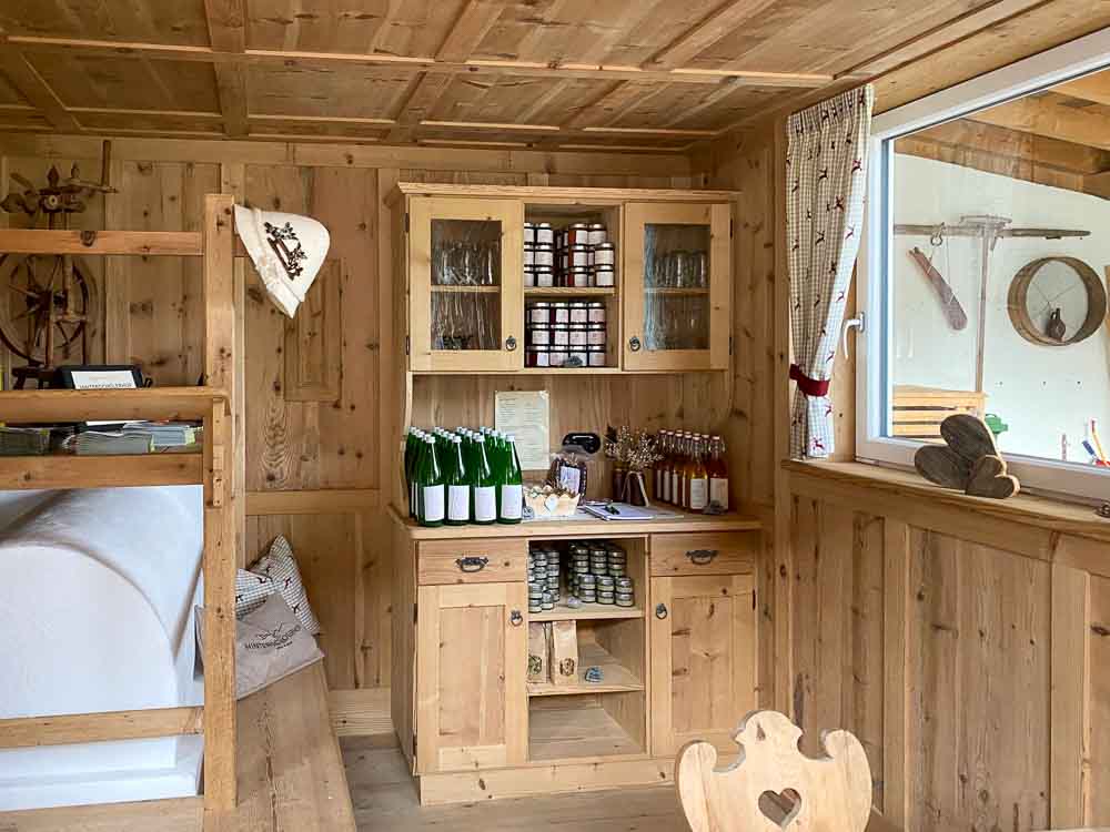 A disposizione di tutti anche la bottega, dove si trovano i prodotti da acquistare: succo di mela e sciroppi, marmellate, uova fresche, salami di capra, sale aromatico e vino. Deliziosa!