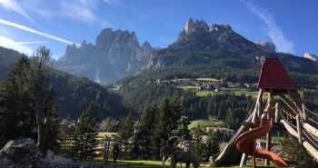 Presente anche un grande prato esterno con sabbiera, trampoli, giochi e una parete da arrampicare.
