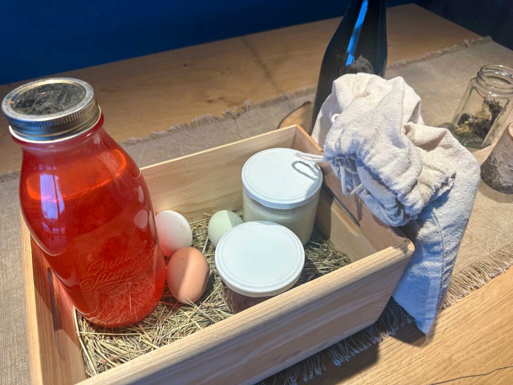 Al mattino potete poi chiedere anche il cestino della colazione, con i prodotti del maso: uova latte, yogurt e formaggio di capra, varie marmellate, speck e Kaminwurst, sciroppi deliziosi come quello al ribes, e poi pane di diversi tipi del panificio del paese di Ega.