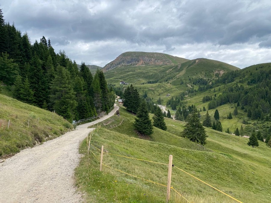 Ci lasciamo il rifugio alle spalle ed entriamo nel bosco, ci aspettano venti minuti di strada in leggera salita per poi diventare pianeggiante e in discesa.