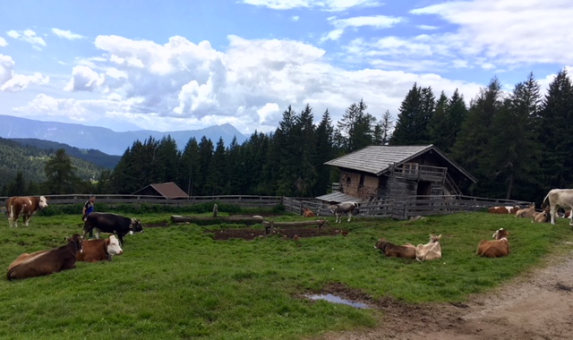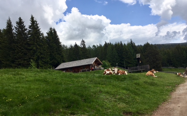 In mezzo a boschi di larici e ai prati si prosegue per circa un’oretta fino a trovare l’indicazione del sentiero 17 e l’indicazione delle malghe meta della nostra gita. Si scende leggermente passando davanti a una piccola baita e si attraversa il ruscello su un simpatico ponticello di legno: attorno tantissime mucche che pascolano!