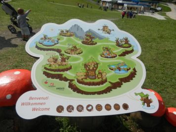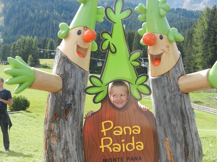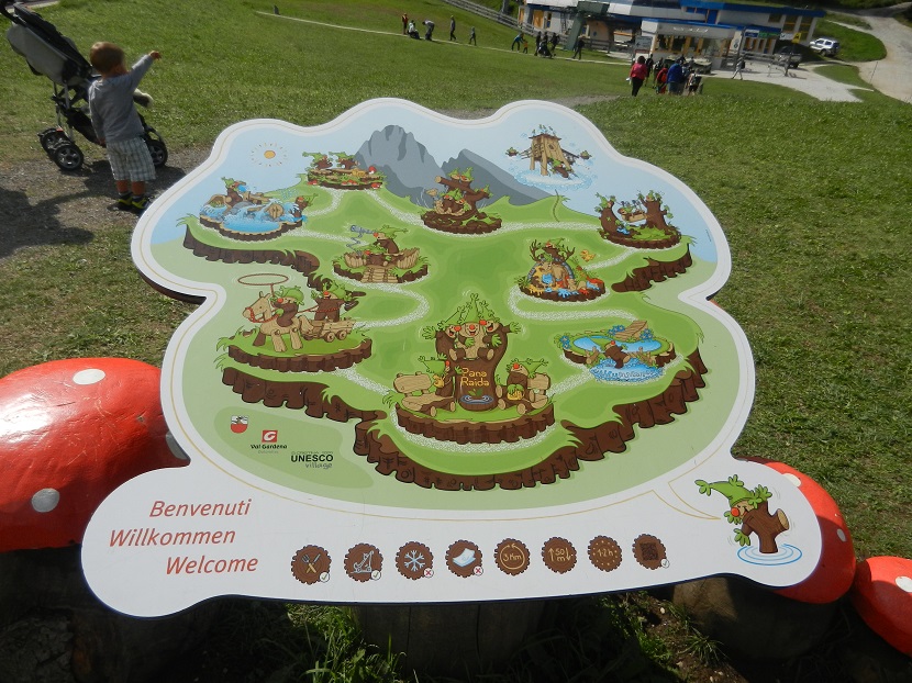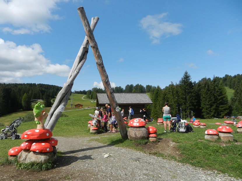 Noi abbiamo lasciato la macchina nell’ampio parcheggio a pagamento (1 euro all’ora, 5 euro giornaliero dalle 7.00 alle 13.00) sul Monte Pana. Si trova a circa 2 chilometri da S. Cristina raggiungibile sia in seggiovia che in macchina. Qui inizia il nostro percorso, tra grossi funghi in legno e simpatici “alberelli portafortuna”.