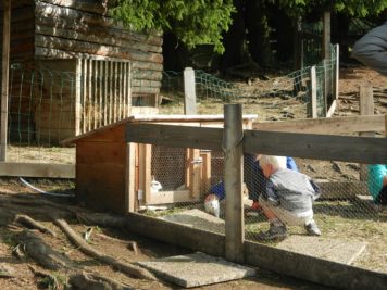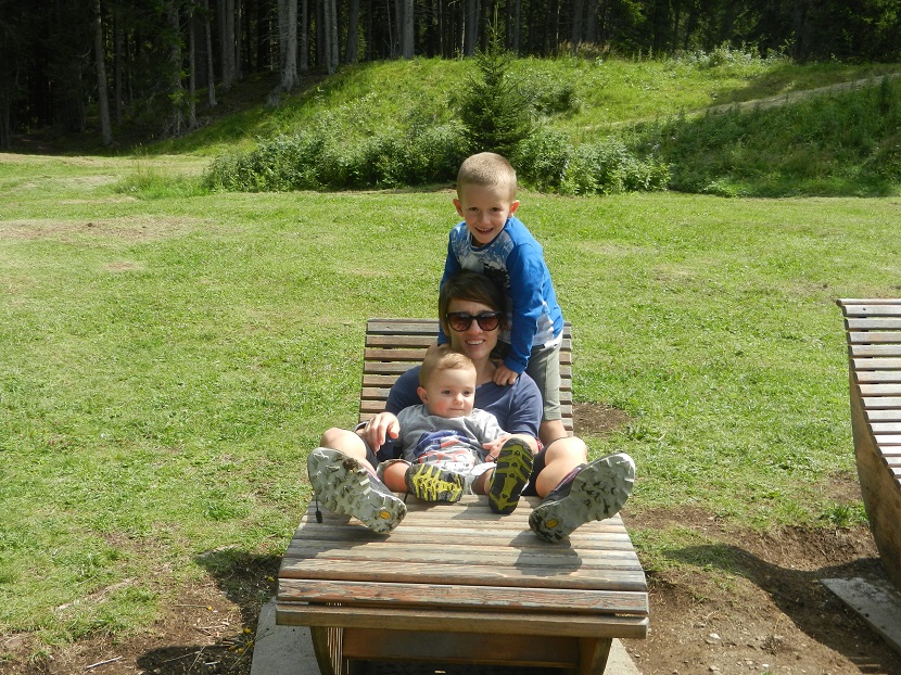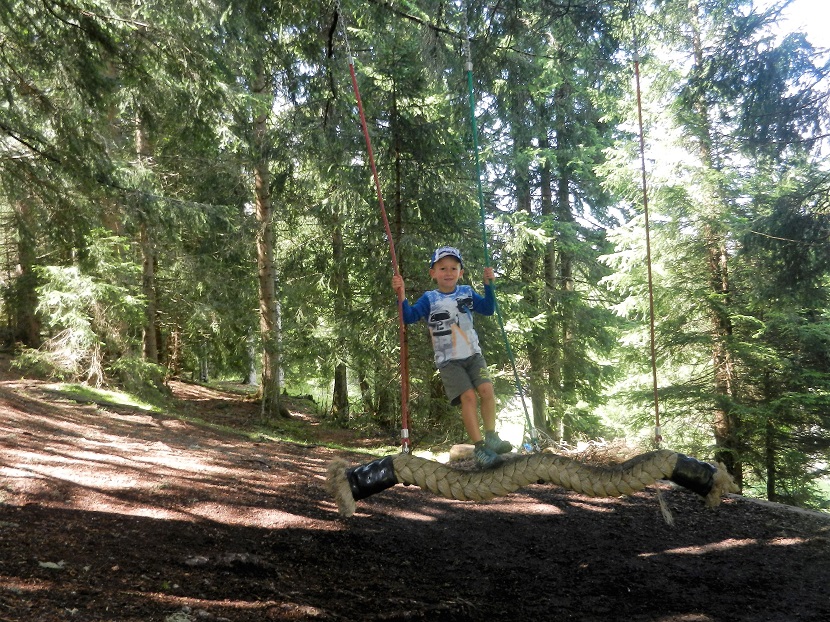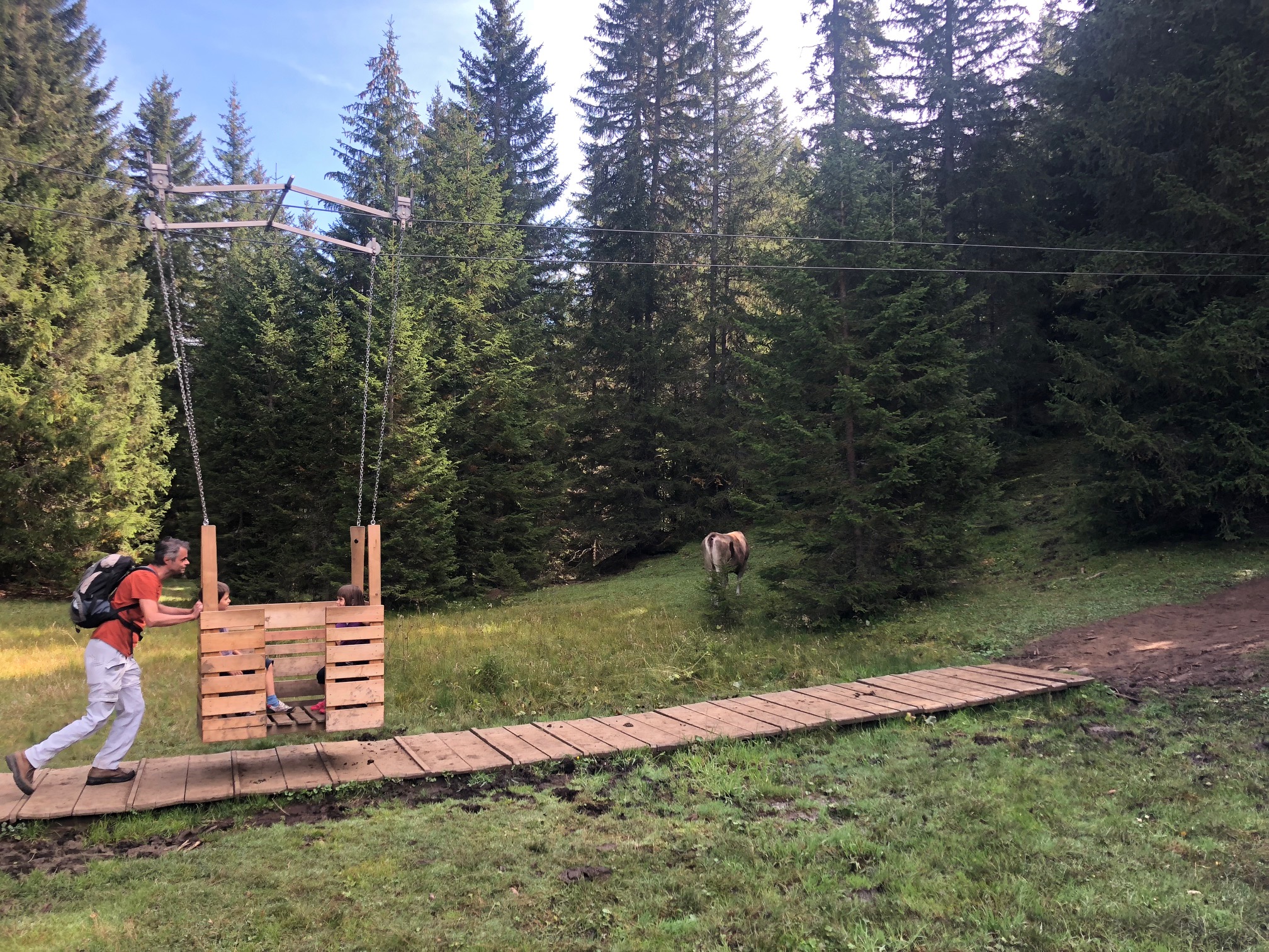 Poco sotto le casette, percorrendo un altro piccolo pezzo di strada nel bosco e oltrepassando una comoda passerella in legno, eccoci arrivati ad una stazione stancante (per gli adulti), ma molto divertente per i bambini: una grande e pesante “mini funivia” in legno, che papà e nonni, incitati dai piccoli passeggeri, spingevano da una parte all’altra.