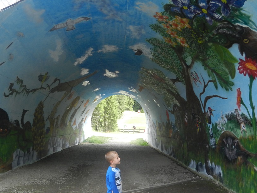 Quando le forze si sono esaurite siamo ripartiti verso le ultime due stazioni: una coloratissima galleria d’arte, con piante e animali disegnati da bambini e ragazzi ed infine il biotopo acquatico, un piccolo laghetto dalle acque fredde e limpide dove si rispecchiava il paesaggio circostante. Sulle rive, comode sdraio in legno dove potersi “sdraiare” e godere della magnifica quiete.