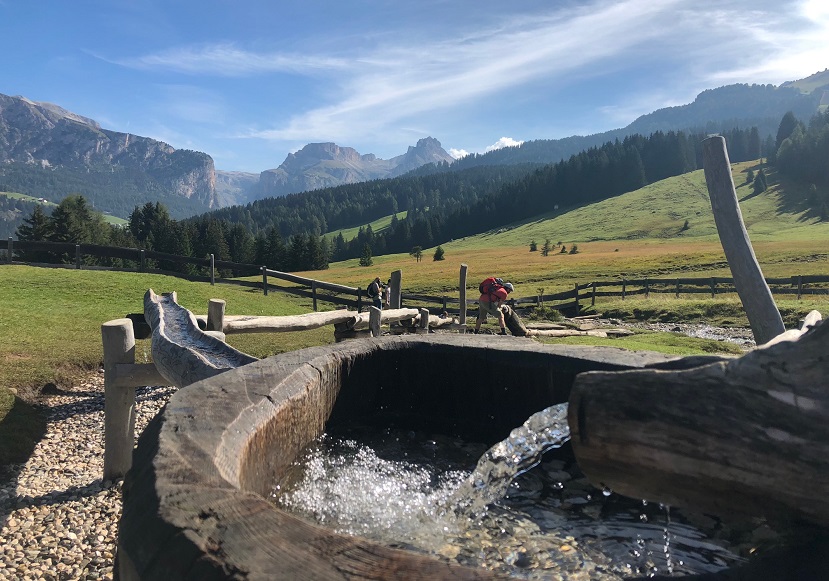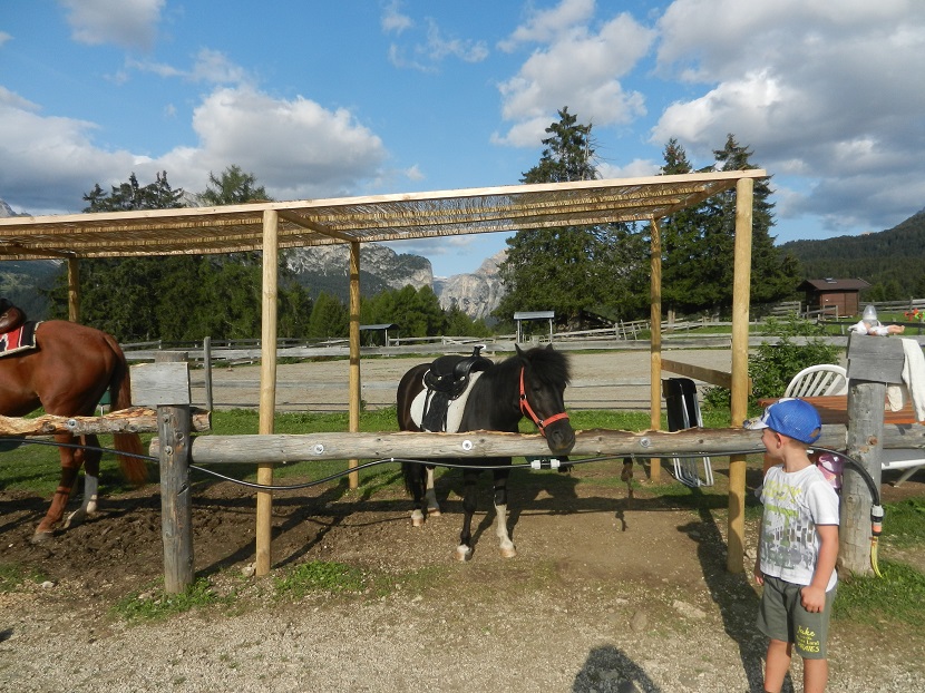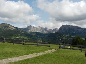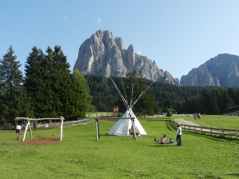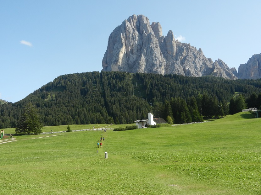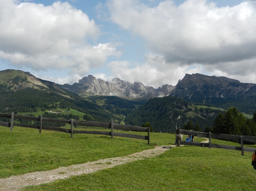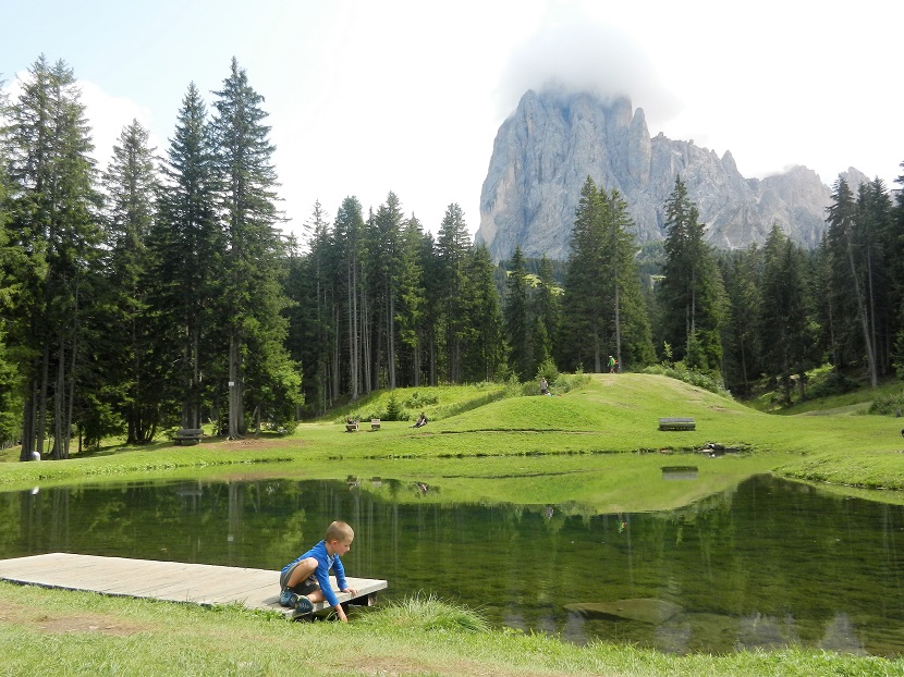 Il paesaggio naturale è meraviglioso: ampi prati di un colore verde brillante, i boschi circostanti di una tonalità più scura e le imponenti cime del Sassolungo e Sassopiatto come sfondo.
