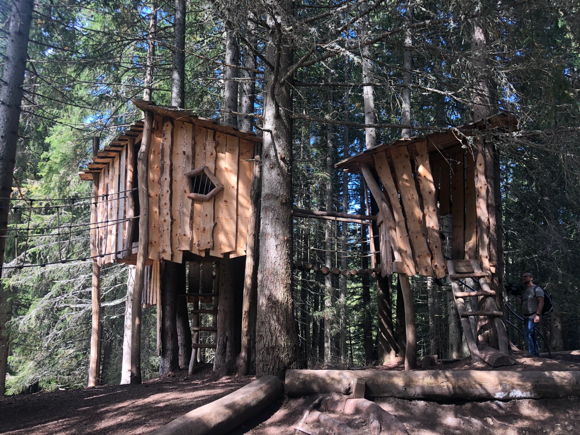 Da qui il percorso si addentra un po’ nel bosco, dove abbiamo trovato, quasi per caso, una gigante altalena, appesa a due grossi alberi. Dopo un bel giro in altalena, siamo arrivati in poco tempo, alle sempre amate casette sugli alberi, collegate fra loro da un percorso sospeso con le funi. Anche qui ci sono alcune panche e tavoli dove poter fare una sosta.