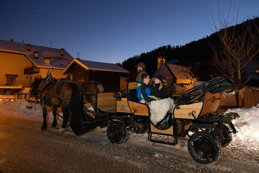 Durante alcune giornate di apertura del mercatino sarà possibile fare un giretto lungo le vie del paese addobbato a festa con la troika, la grande slitta trainata dai cavalli.