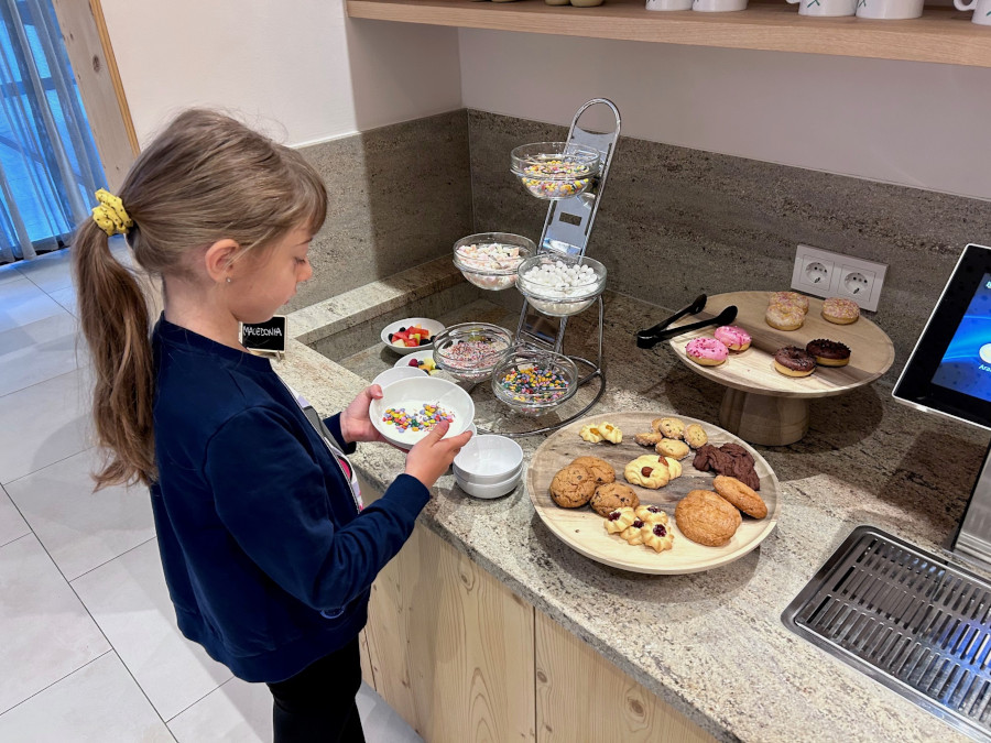 L’angolo per i bambini con buffet alla giusta altezza è ricco di bontà: donut, pasticcini, biscotti e tante codette, smarties, meringhe per rendere ancora più delizioso lo yogurt.
