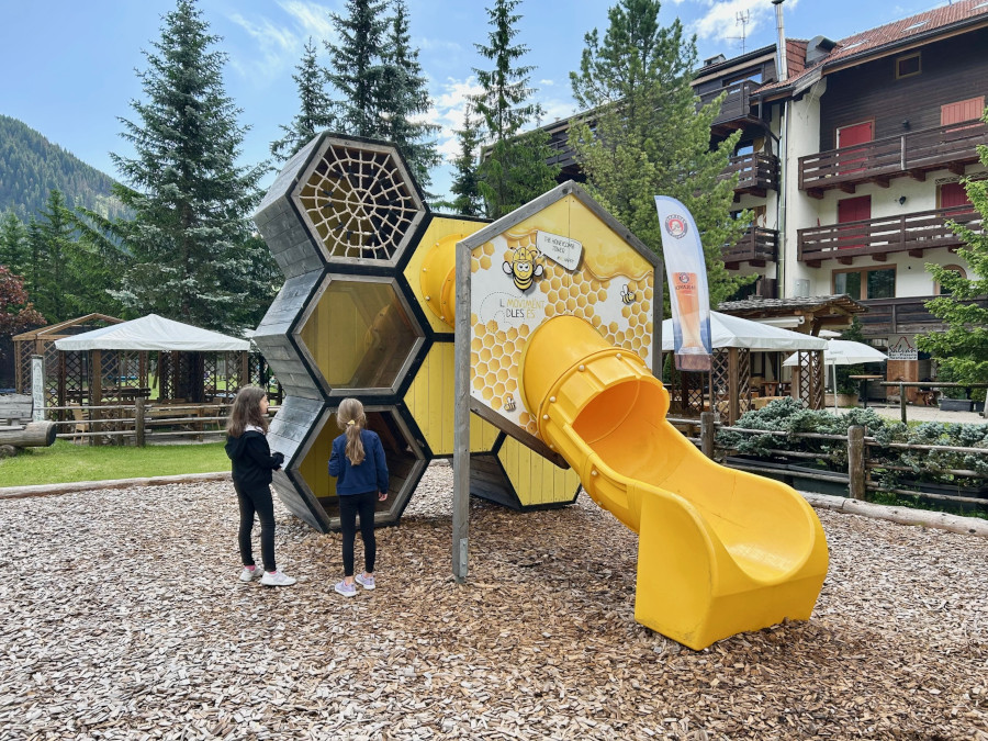 All’esterno un piccolo parco giochi e sentiero con 5 stazioni a tema api, i pannelli spiegano in modo semplice e interattivo molte curiosità su questo piccolo insetto. Molto carina la struttura in legno con lo scivolo e gli alveari da scalare.