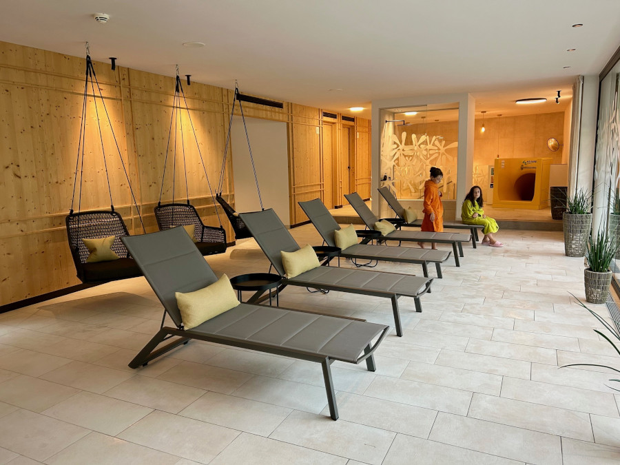 Al primo piano una baby piscina riscaldata (30 cm) con scivolo trattore, tavolo acquatico con giochi, sauna per famiglie e area con lettini. I bambini di ogni età possono godersi la loro prima sauna, in compagnia dei genitori. Sempre a disposizione acqua fresca.