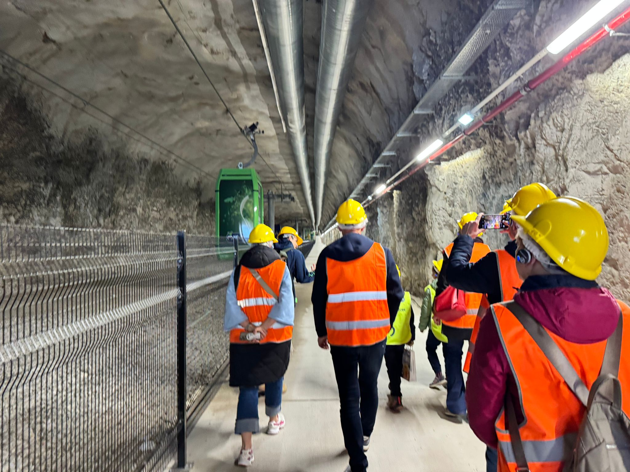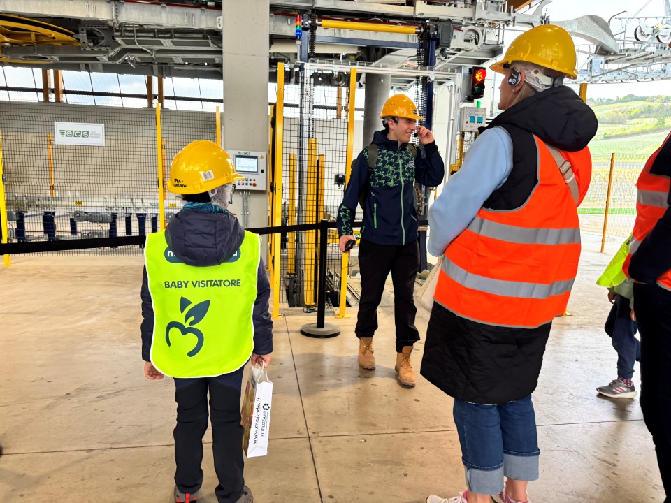 Pronti per iniziare questa avventura? Ci si prepara con caschetto e gilet e si sale sul pullman che porta velocemente alla prima tappa: la stazione a valle del primo impianto al mondo che trasporta le mele. Il 10% della produzione totale di Melinda, per la maggior parte mele Golden, la cosiddetta “funivia delle mele”, un sistema utilizzato per trasportare le mele dall’esterno fino alle celle dentro la montagna. Un chilometro e trecento metri di lunghezza, che copre 84 metri di dislivello e viaggia a 5 metri al secondo. Un tragitto di 4 minuti circa per trasportare i frutti da valle a monte. Qui potrete vedere in azione le 28 cabine (più una riservata al trasporto persone), ognuna contenente tre cassoni.