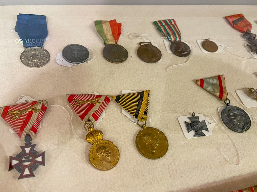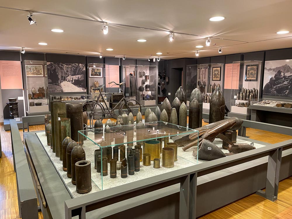 Fra i reperti più interessanti figurano: una mitragliatrice Schwarziose, numerosi protettili di artiglieria pesante e leggera, abiti, attrezzature varie, documentazione in originale e decorazioni militari, lettere inviate dai soldati alle famiglie, cartoline d’epoca e una grande carta geografica che mappa i confini dell’impero austro-ungarico.