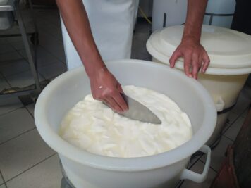 Successivamente ci siamo occupati anche del formaggio, con tre diverse lavorazioni: il primosale e un altro formaggio a pasta molle tipo taleggio, per i quali il latte viene tenuto ad una temperatura meno calda, ed un terzo tipo di formaggio, destinato ad una stagionatura più lunga, il quale invece viene riscaldato ulteriormente dopo aver proceduto con il taglio della cagliata (che avviene dapprima con una lama e poi con uno spino che tradizionalmente era costituito da un ramo di albero a molte punte – oggi esiste un apposito utensile!)