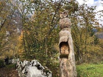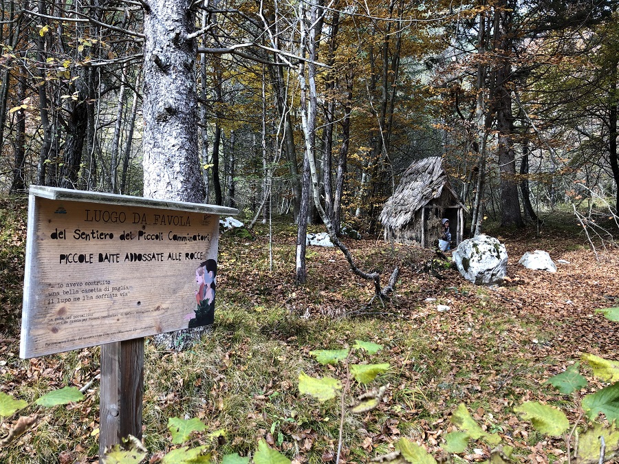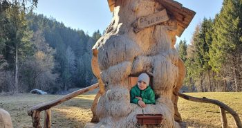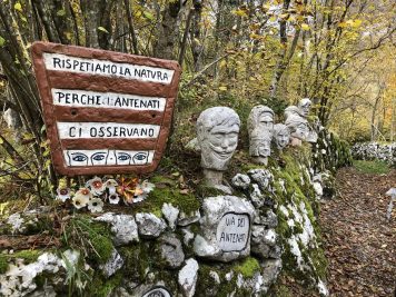 Lasciando le baite alle spalle attraversate la strada sterrata e prendete subito il sentierino di fronte che scende leggermente. In alternativa si può proseguire a sinistra sulla strada sterrata e prendere a destra la strada nel bosco un po’ più ampia. È facilmente intuibile. Lungo il primo sentiero troverete opere d’arte costruite da qualche “artista del posto”, curiose e divertenti.