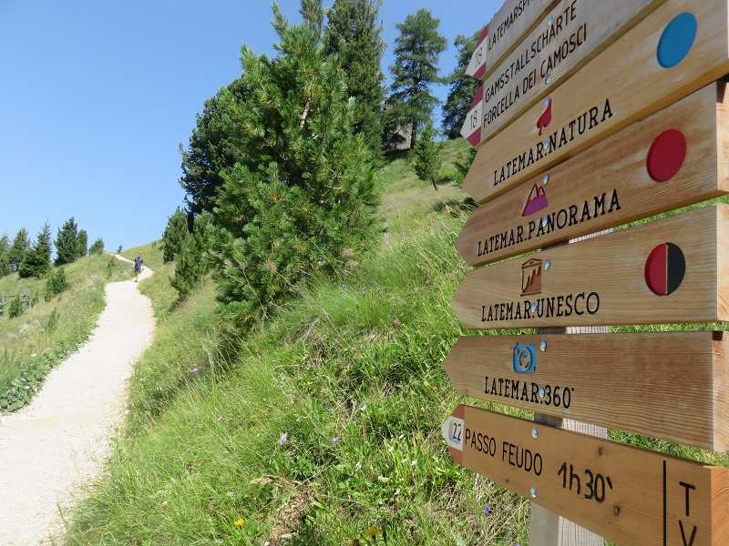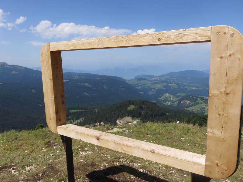Ci siamo incamminati subito lungo il sentiero n. 18, seguendo le indicazioni per Latemar.Natura. Ben presto siamo giunti alla piattaforma panoramica Latemar.360° . Poco più avanti , dove si imbocca il sentiero 22, abbiamo trovato un’altra attrazione: il “cinema di montagna”. Qui basta sedersi e godere dello spettacolo proiettato in diretta, proprio come in una sala cinematografica. La pellicola proiettata è sempre la stessa: il favoloso panorama che si apre davanti ai vostri occhi!