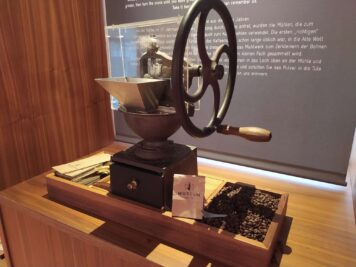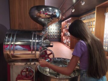 Siamo stati a visitarlo per voi ed è stata veramente una piacevole scoperta. Il museo e la torrefazione si trovano all’interno di un moderno edificio in vetro, facilmente riconoscibile dalla strada. È a disposizione dei visitatori anche un ampio parcheggio gratuito. Appena varcata la soglia si entra nello spazio commerciale (in vendita anche le piantine di caffè, bellissime!) mentre l’esposizione museale inizia sulla scala a chiocciola che porta al piano superiore, avvolta nel verde delle piante. Il verde è uno dei colori dominanti nel museo e ci fa subito pensare a foreste tropicali e paesi lontani… quelli da cui provengono i preziosi chicchi dai quali si ricava la bevanda più popolare nel mondo!