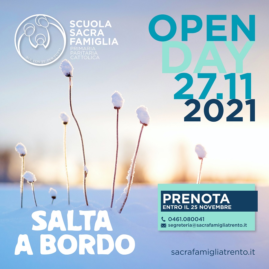 Sabato 27 novembre la Scuola Sacra Famiglia di Trento – a poca distanza da piazza Venezia ma comodamente raggiungibile in macchina – organizza un open day in presenza, per permettere alla famiglie che devono iscrivere i bambini alla primaria di scoprire la struttura, la sue finalità educative e i metodi utilizzati. È necessario prenotare la visita entro giovedì 25 novembre 2021 chiamando lo 0461.080041 o scrivendo una mail a segreteria@sacrafamigliatrento.it