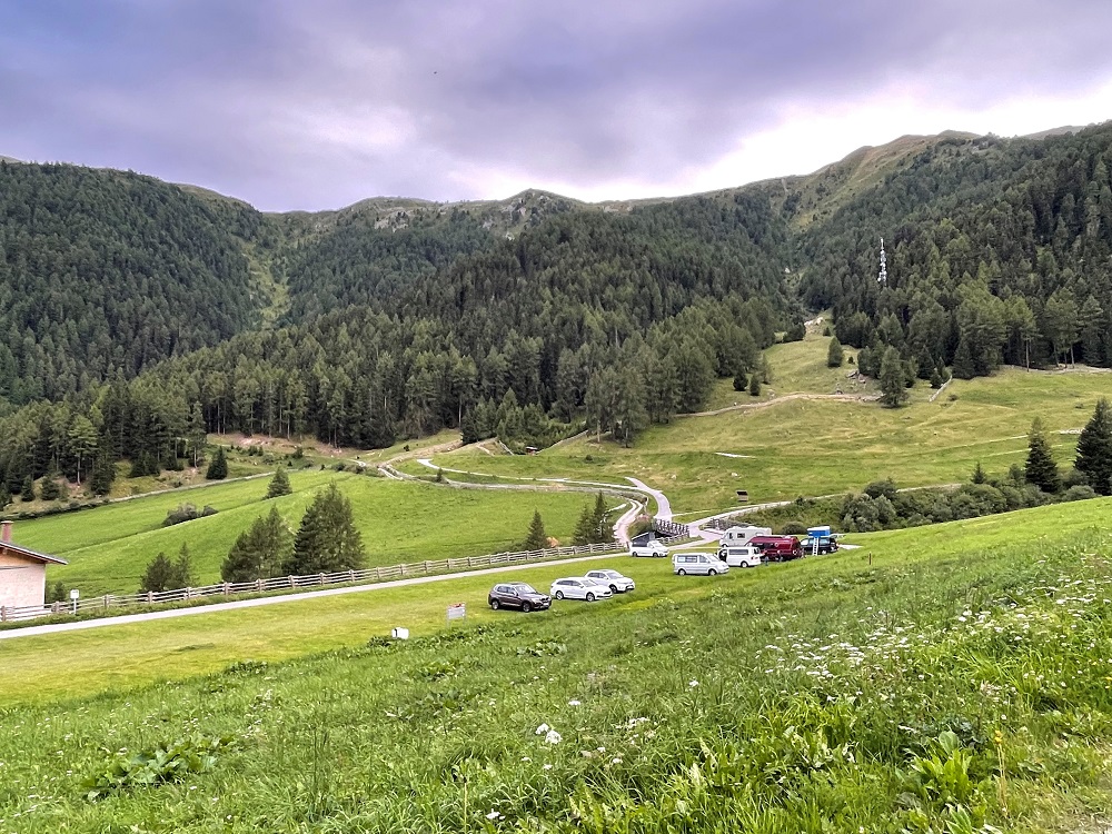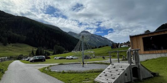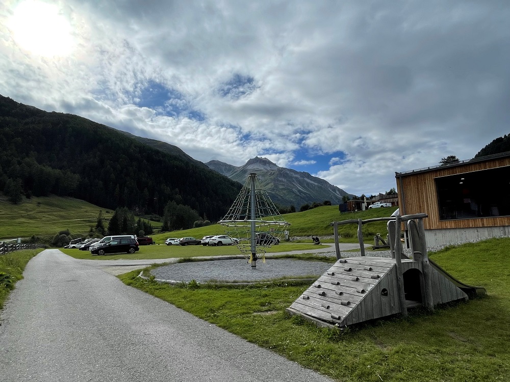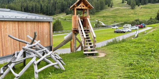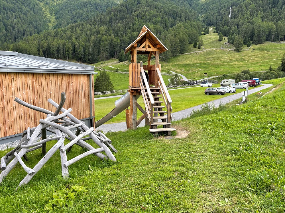 Se vi trovate in val Venosta e volete un posticino dove dormire in mezzo al verde vi suggeriamo di attraversare il centro di Slingia, si arriva ad un comodo parcheggio a pagamento (8 euro al giorno), con spazio giochi carino: uno scivolo a tubo, una giostra su cui arrampicarsi e alcuni saliscendi.