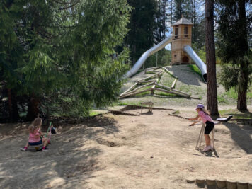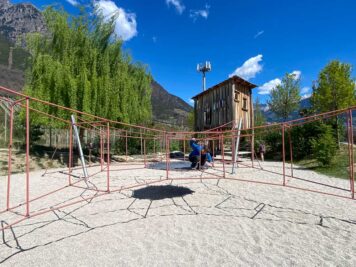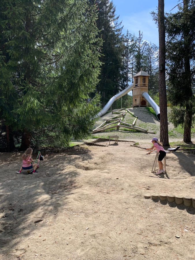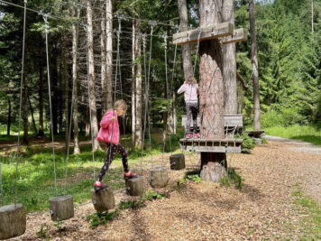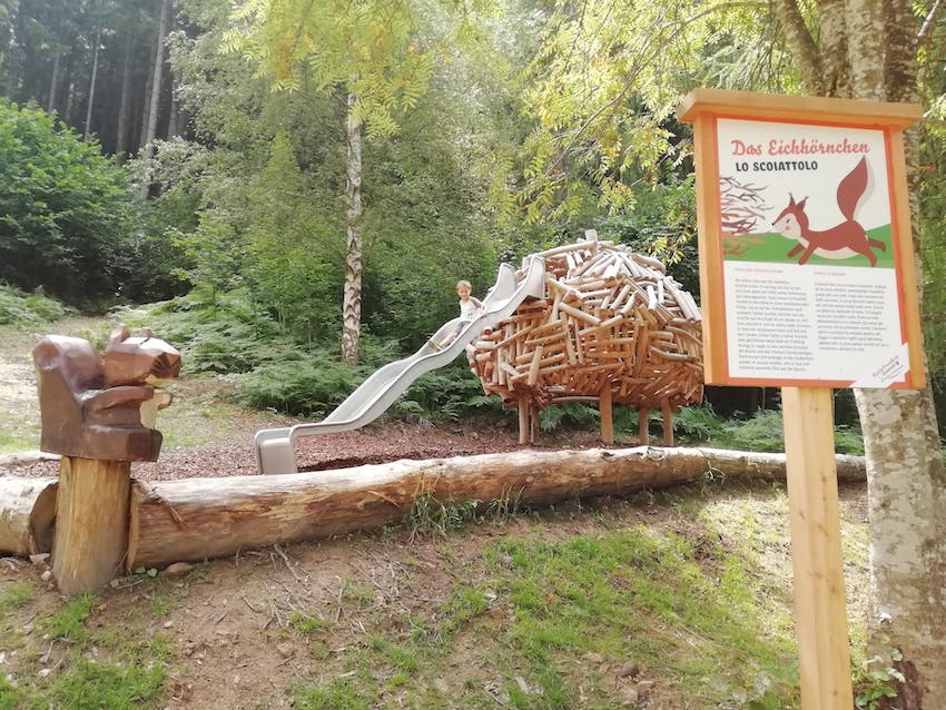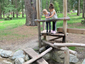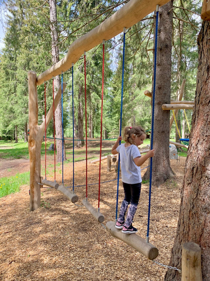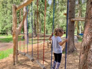Un bellissimo parco giochi in Alto Adige a tema con una zona delimitata dedicata ai bambini più piccoli, con una bella casetta in legno sopra ad una sabbiera, scivoli, altalene. Per i più grandini, superata la zona relax con le panchine c’è una grande costruzione in legno con tantissime corde dove arrampicarsi.