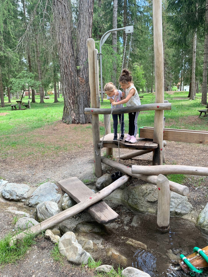Ci sono anche due grandi scivoli e una grande pompa idraulica che permette di caricare l’acqua in un grande contenitore da dove poi i bambini possono farla ridiscendere lungo percorsi in legno, tra dighe, gradini e mulini. Leggete QUI.