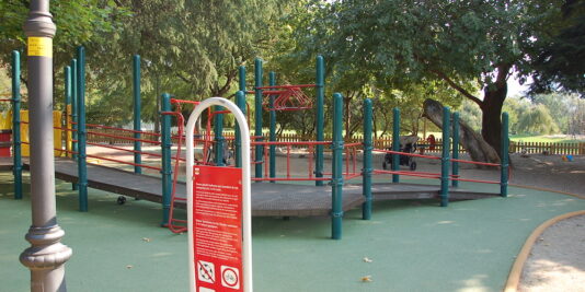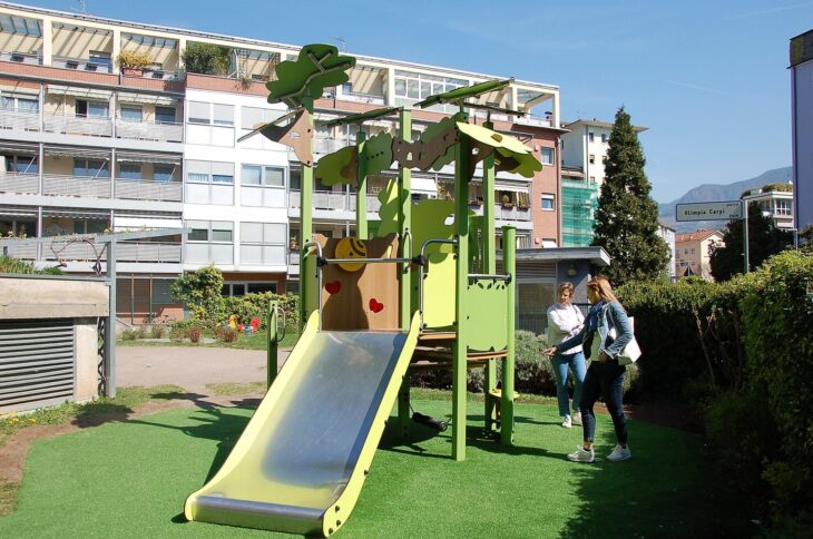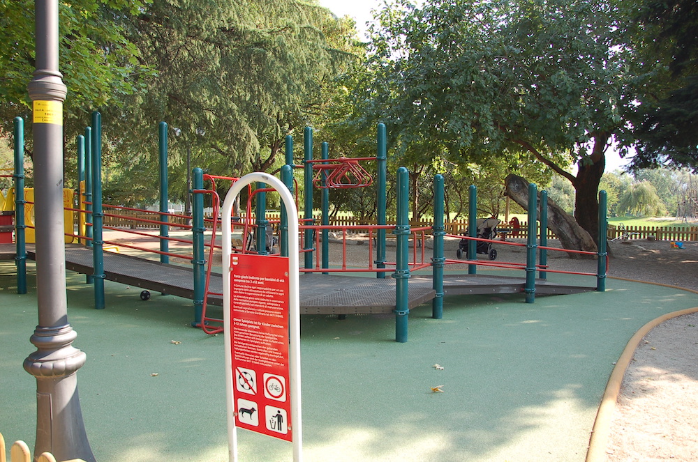 BOLZANO (BZ) | parco Olimpia Carpi. Qui si trova un nuovo gioco multifunzione (2022) adatto ad essere utilizzato da bambini già dai due anni di età ed accessibile anche a bambini con disabilità. A tema natura, con pannelli sagomati a chioma d’albero con rami e foglie, la struttura è dotata di un piccolo scivolo largo un metro, diversi pannelli ludici ed una seduta oscillante a livello del terreno. Il sottofondo di tutti i giochi è stato realizzato con una speciale erba artificiale, morbida, antistatica ed anti-abrasione, appoggiata su tappetino anti-trauma. (foto di copertina)