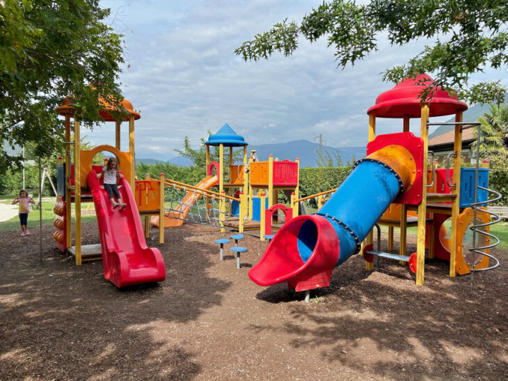 Una teleferica, sempre molto apprezzata dai piccoli, e un tappeto elastico. Alcuni dondoli, una giostra, una struttura per l’arrampicata e una sabbiera.