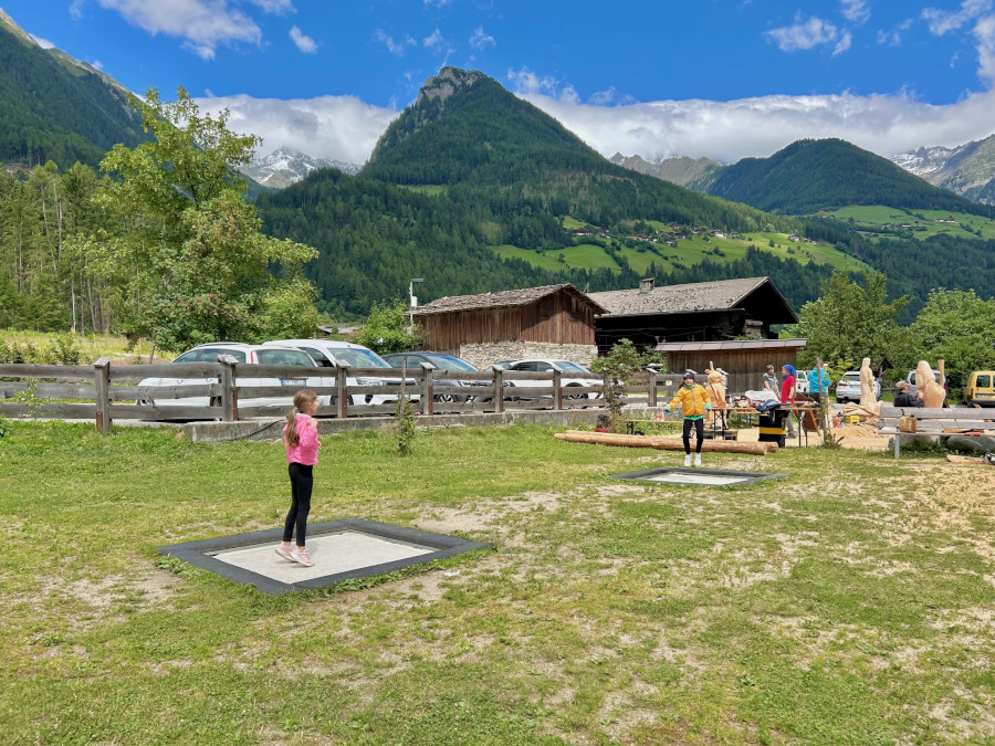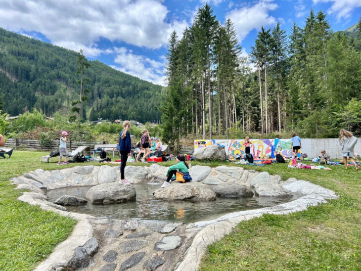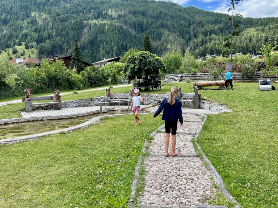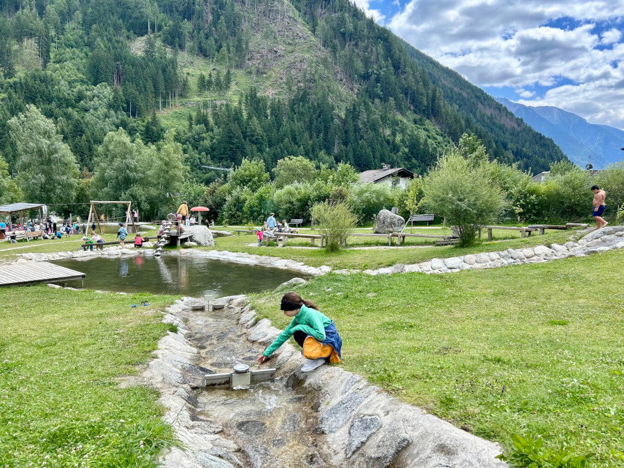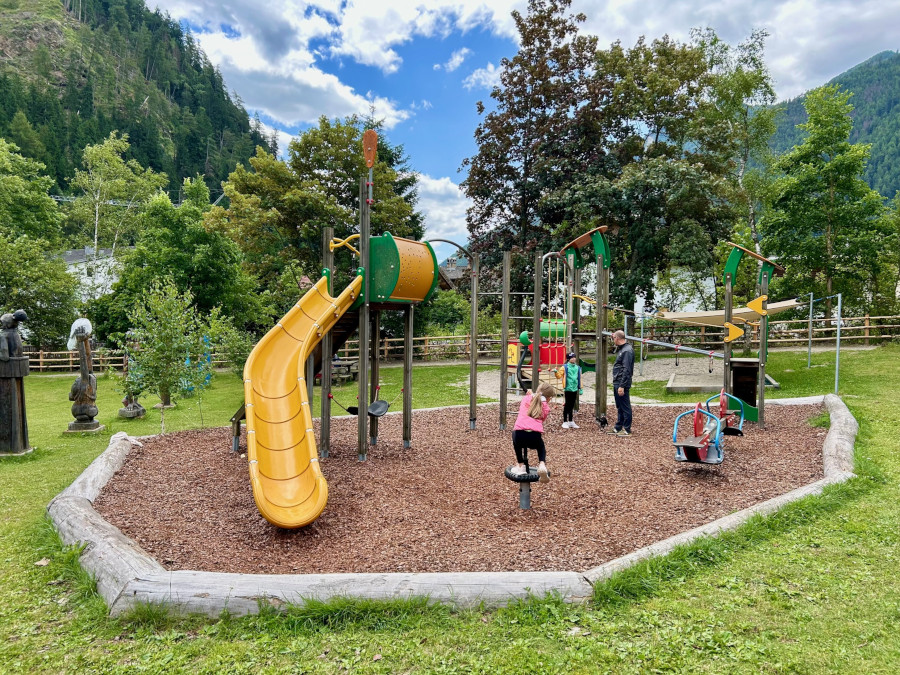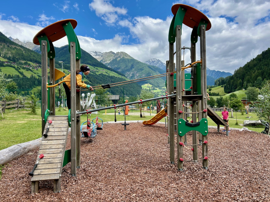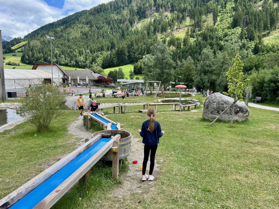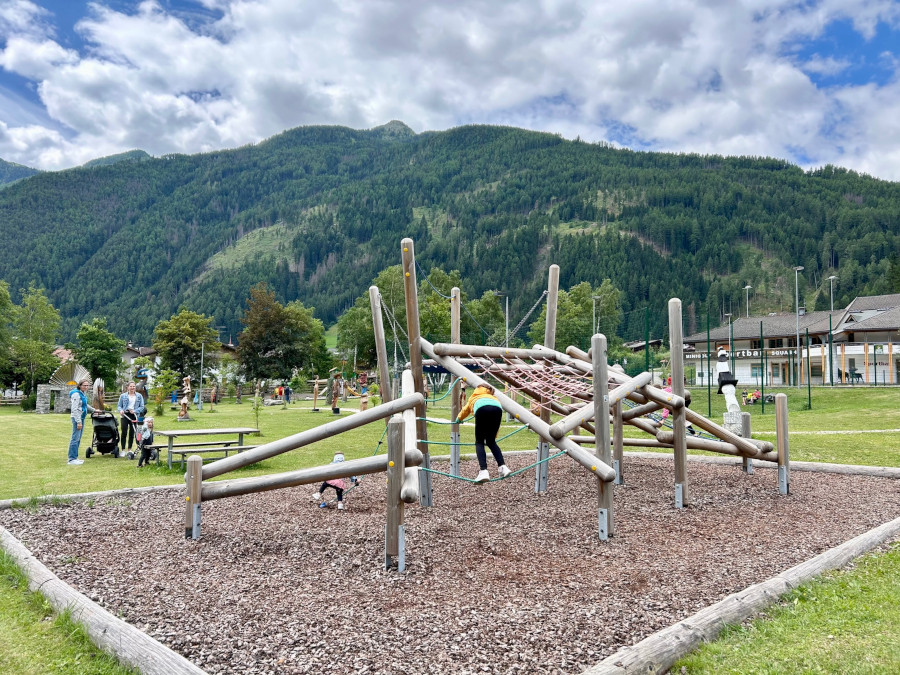 Il parco giochi a Lutago è stato una vera sorpresa! Dal parcheggio sembrava come tutti gli altri: una parete d’arrampicata, una struttura con lo scivolo e qualche tappeto elastico. In realtà dietro al minigolf si apre una grande area verde attrezzata con laghetti, ruscelli, percorso Kneipp e una lunga carrucola. Con tutte queste attrazioni il divertimento è assicurato! Da qui parte il sentiero per la cascata Schwarzbach e volendo anche per la Schwarzbachalm.