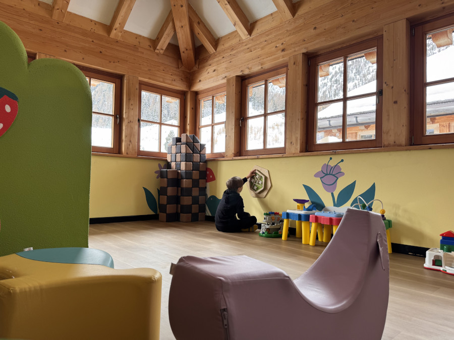 Nella zona esterna non poteva mancare un vivace parco giochi sulla neve adatto ai bambini più piccoli con piccole casette, un tappeto elastico, l’altalena, slitte e bob per lasciarsi scivolare su piccoli pendii.