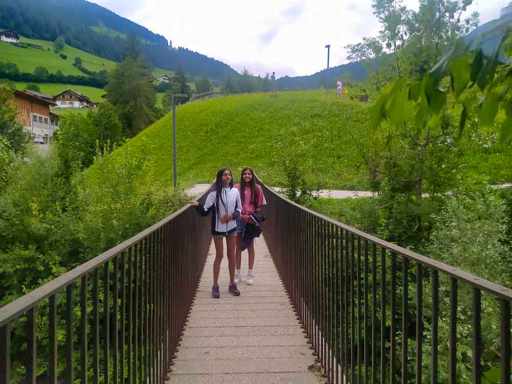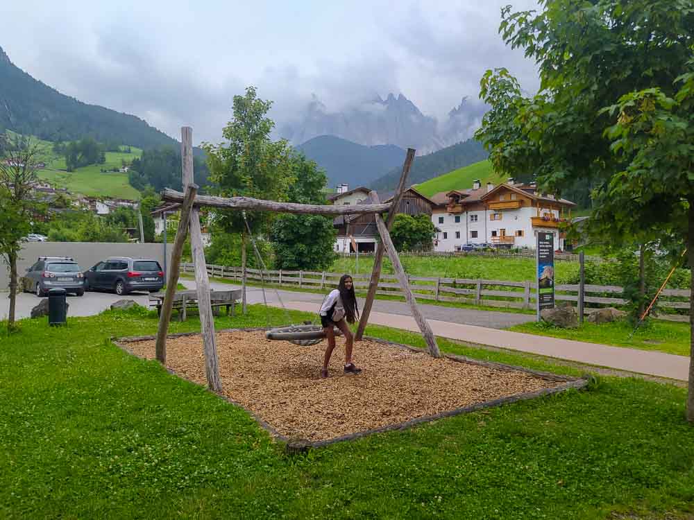 Dalla strada principale della Val di Funes, all’altezza di San Pietro, si seguono le indicazioni per Santa Maddalena. E’ la strada che porta alla celebre chiesetta di San Giovanni di Ranui. Noi però ci siamo fermati prima, seguendo la cartellonistica per il Centro Visite, sempre ben segnalato. C’è un comodo parcheggio gratuito sulla sinistra, proprio a fianco del torrente. Lasciata l’auto si deve superare il ponte sospeso sul torrente: questo ponte piacerà un sacco ai bambini perché nonostante l’aspetto “rigido” è in realtà un ponte “molleggiato”, che si muoverà cioè sotto i vostri piedi. Superato il ponte si sale un sentierino lungo il quale sono collocati dei cubi dedicati alla creazione del mondo. Il centro visite si trova a pochissimi passi, ed accessibile anche a passeggini e sedie a rotelle.