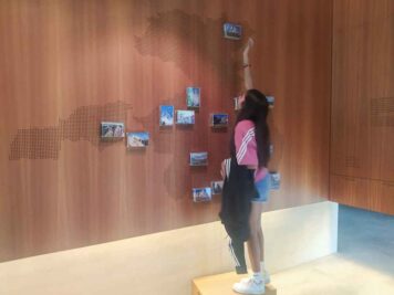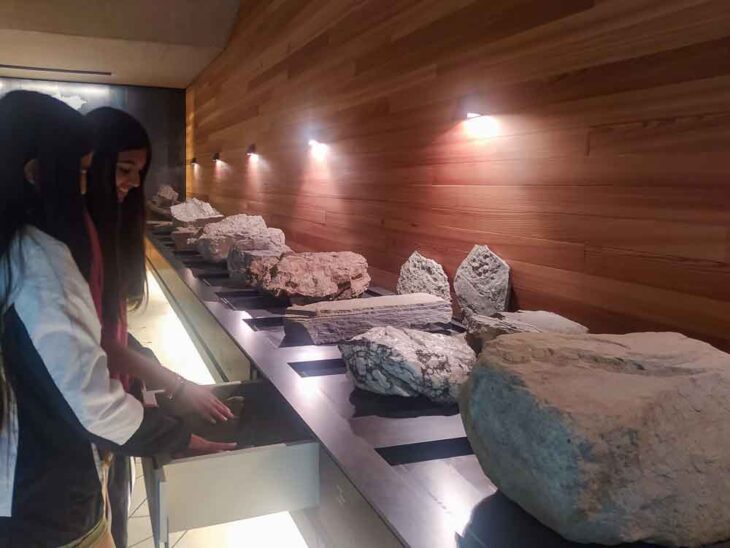 L’interno, la cui architettura moderna e rilassante riprende quella degli esterni, è disposto su due livelli. Al piano terra si trova la sala per le proiezioni, uno spazio per mostre temporanee (noi ne abbiamo vista una molto interessante sugli anfibi) e un interessante zona dedicata alla geologia, dove osservare e toccare con mano i diversi tipi di roccia nei quali ci si può imbattere. Presenti anche dei visori appesi al soffitto: tirandoli all’altezza dei vostri occhi in ognuno di essi potrete osservare una diversa cima delle Dolomiti. E poi tanti cassettini da aprire, ognuno dei quali contiene altri dettagli e informazioni.