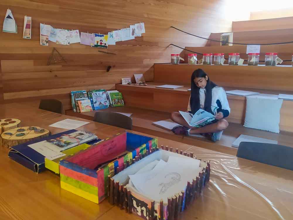Si sale poi al piano superiore: qui si trova una confortevole ed accogliente zona dedicata ai più piccoli, con libri, gradinate su cui fermarsi a leggere e un tavolone dove disegnare o sperimentare qualcuno dei giochi didattici a disposizione.