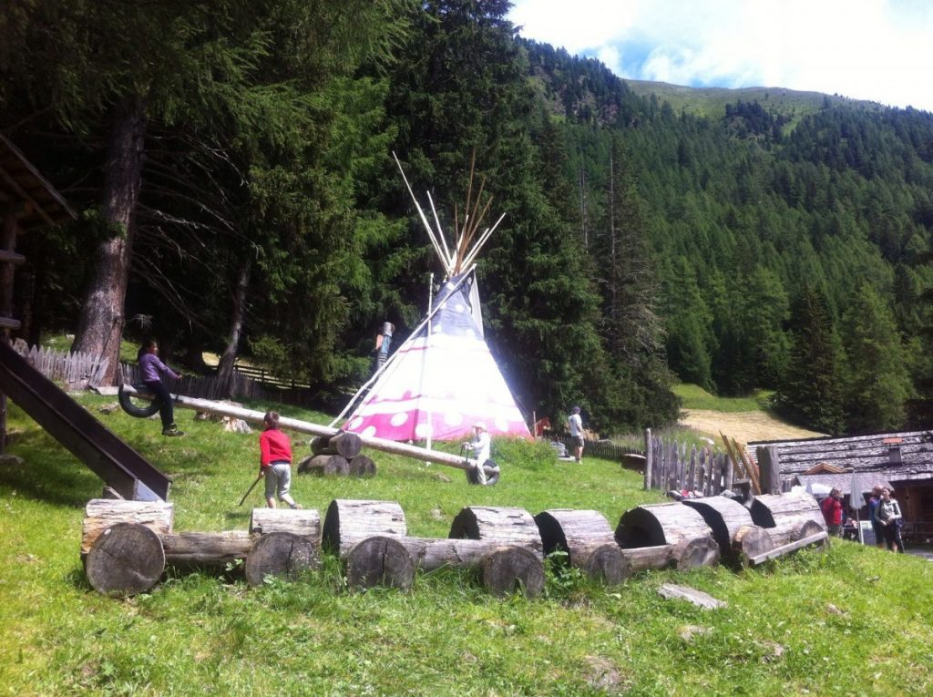 Ma sono i giochi che ci stupiscono, allestiti con tanto amore dai proprietari. Ecco un trenino e un trattore fatto con i tronchi di un albero e poi una grande tenda indiana con un coloratissimo totem e le altalene.