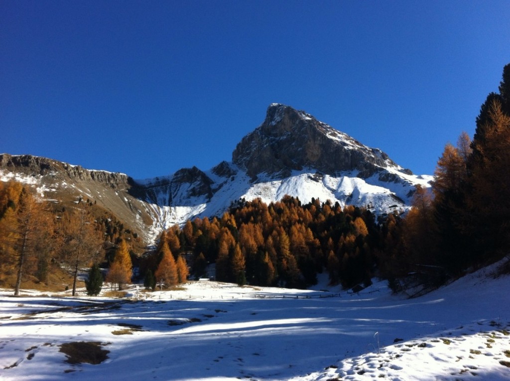 Passando davanti agli impianti di risalita di Pozza, siamo arrivati con la macchina fino all’ultimo parcheggio e poi abbiamo proseguito a piedi fino alla Baita alle Cascate (2011 metri d’altitudine) dove abbiamo trovato – sorpresa! – anche la neve: una spruzzatina sui prati, che abbiamo calpestato con gioioso anticipo.