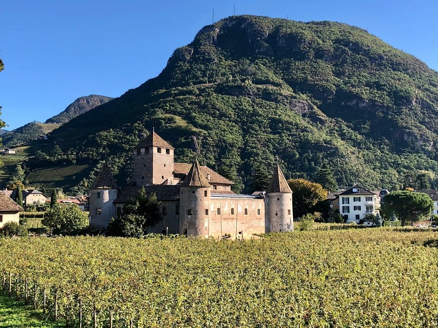 I colori sono davvero stupendi e il verde intenso e poi il rosso, il giallo. Rimaniamo stupiti come a 10 minuti dal centro ci sia così tanta campagna e viti ovunque. Ed eccolo Castel Mareccio, antico maniero del XII secolo in mezzo ad un vigneto di pregiate uve Lagrein.