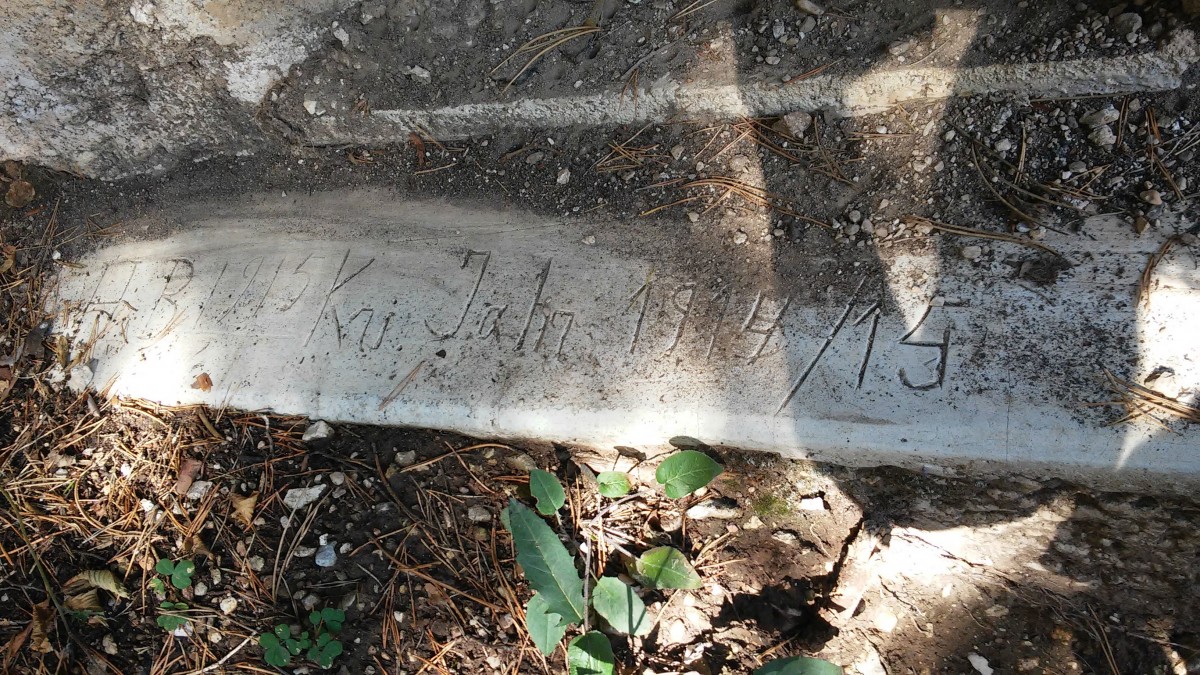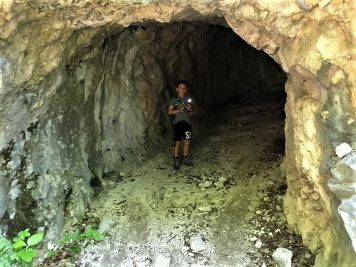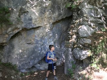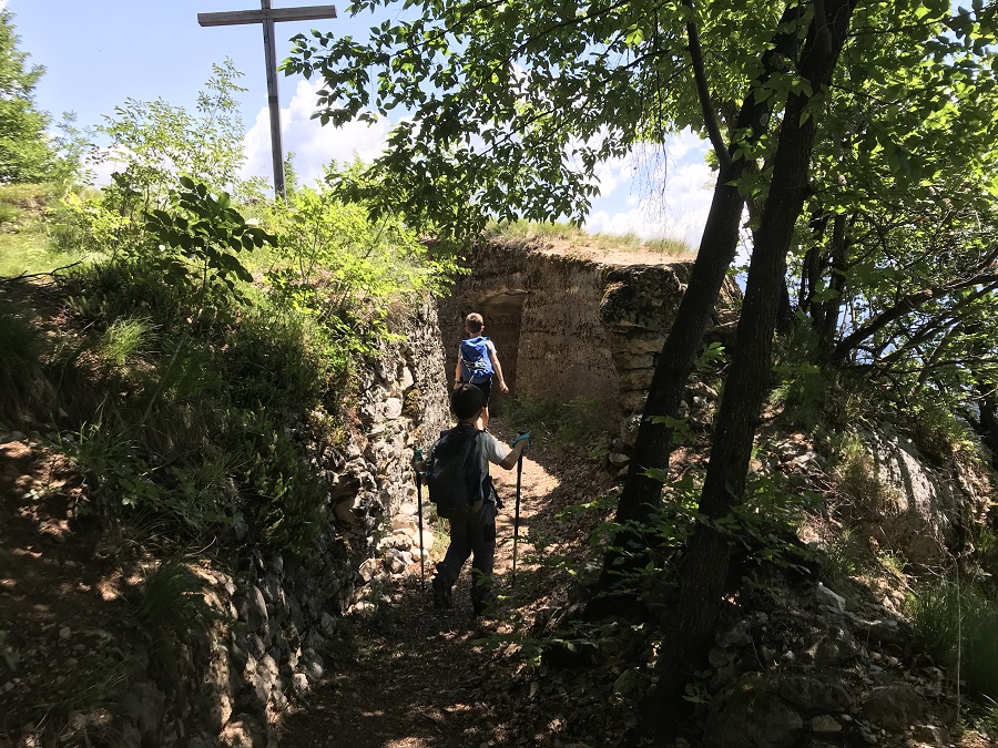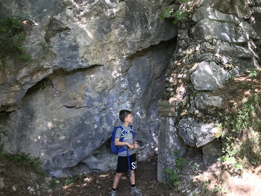 Il primo tratto è molto semplice, poi il terreno diventa più ripido, ma del tutto sicuro. Ai bambini l’idea di poter visitare le trincee con le torce piace così tanto che non sarà un problema farli camminare lentamente. Si incontra subito un posto di vedetta da cui si dominano tutti i dintorni. Le scritte lasciate dai soldati ci hanno permesso di fantasticare un po’ sulla loro storia e sulla loro vita: cosa pensavano? Cosa facevano per ingannare l’attesa?scritta