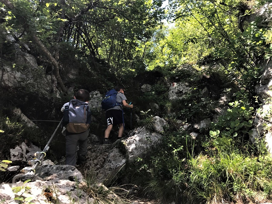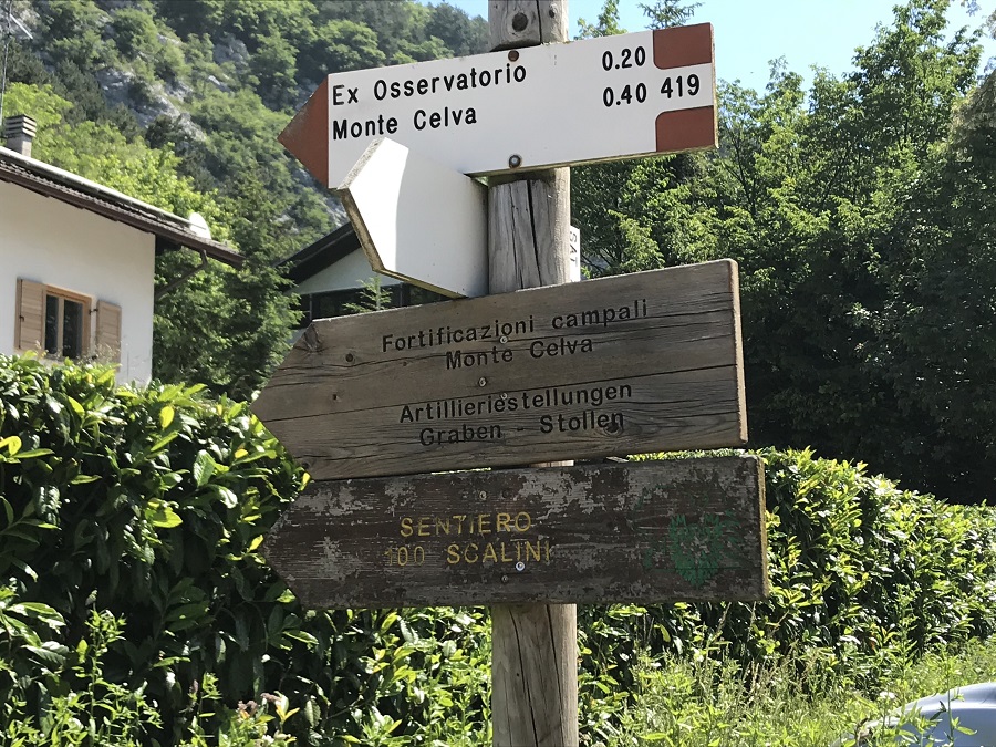 Inizia l’avventura! Si sale seguendo il cartello Sentiero 100 scalini, numero 419 in direzione del monte Celva e delle sue trincee.