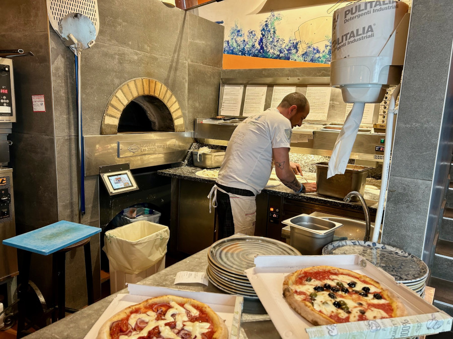 Una grande varietà di pizze classiche, calzoni, focacce o cocci con impasto lievitato 72 ore anche senza glutine, possibilità di mozzarella senza lattosio o vegana. Vasta scelta di ingredienti e abbinamenti insoliti ed equilibrati.. stupiti anche per l’assortimento vegano. Qui sotto Salvo, il pizzaiolo, all’opera. Possibilità anche di pizza da asporto.