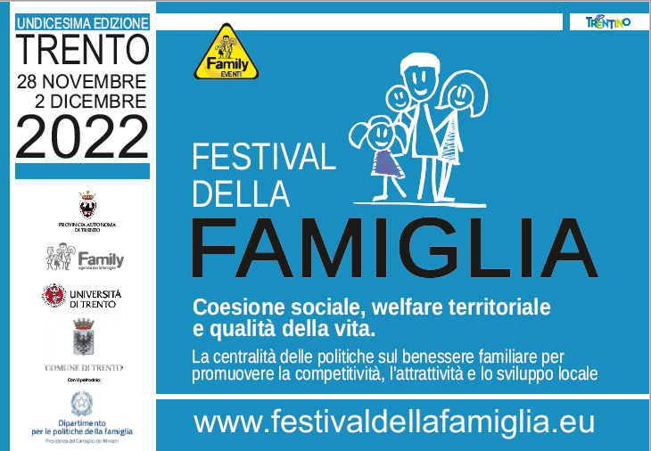 Il Festival che mette la famiglia al centro e che quest’anno ha come oggetto principale la coesione sociale, il welfare territoriale e la qualità della vita. QUI trovate tutto il programma. Dal 28 novembre 2022 al 2 dicembre 2022. Segnaliamo, in linea con questo elenco di appuntamenti interessanti per i genitori, venerdì 2 dicembre 2022 alle ore 9.30 fino alle ore 12.30 presso Casa Moggioli in via Grazioli, 25 a Trento l’incontro “Euregiofamilypass: punto di incontro tra territorio e famiglia”.