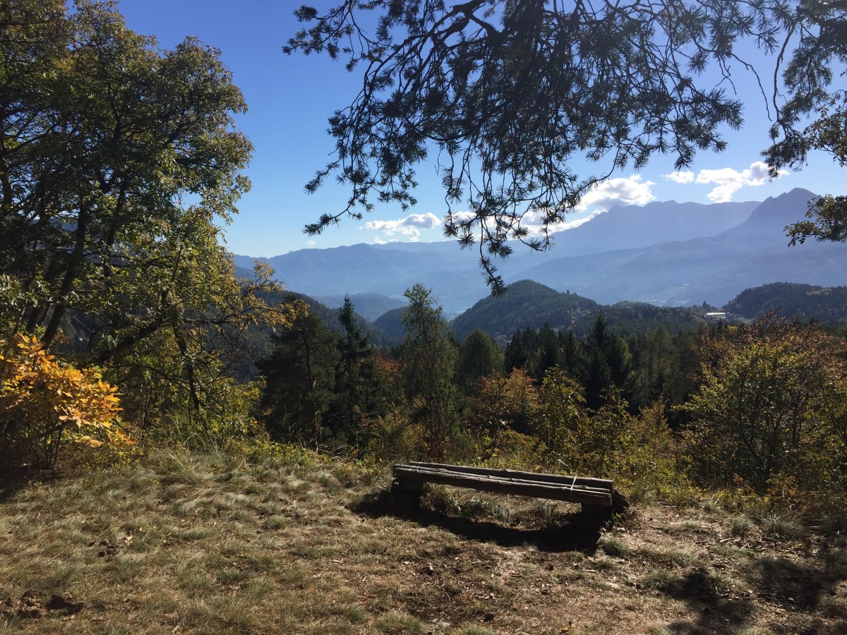 Ci siamo inoltrati alla scoperta di una leggenda che aleggia sui boschi della zona: quella di Jacopino, terribile sovrano del pinetano nel Medioevo, decapitato dai contadini in rivolta e padrone di un castello, precisamente quello “de la Mot” o anche detto Castel Belvedere, di cui oggi rimangono solo pochissimi resti, ma di cui rimane intatta la meravigliosa posizione panoramica. “Sulle orme di Jacopino” è una bella passeggiata animata da cartelli e indicazioni curiose, create dalle classi della zona qualche anno fa: alcuni danno notizie sugli alberi che popolano il bosco (ontani, noccioli, betulle, abeti e pini per citarne alcuni), altri conducono proprio al castello dell’antico sovrano e al bellissimo maso Purga (dal nome della zona “Purga”, storpiatura dell’antico “Burg”, castello). All’inizio la passeggiata, che dura poco meno di un’oretta se non vi fermate, alla ricerca di funghi, fogli o animaletti autunnali, parte su una strada asfaltata che fiancheggia belle casette per villeggiatura e che, passata una coltivazione in serra di fragole, tipica di queste zone, conduce diretta al bosco.