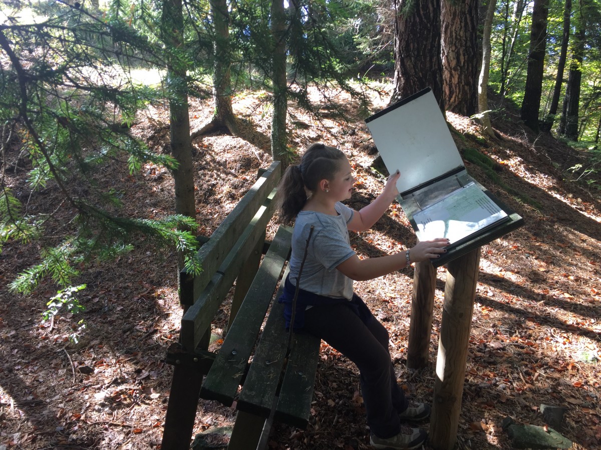 In questo bosco è concesso tirare con l’arco e infatti tutta la zona è costellata di bersagli a cielo aperto ed è divertente scovarne le strane posizioni, ma in realtà la cosa migliore è il fresco del sottobosco e, a detta dei bambini, gli stupefacenti incontri sul cammino: scoiattoli, lucertole e niente poco di meno che una bella salamandra. La luce del primo pomeriggio filtra fa gli alberi e anche se il sentiero nel bosco volge lentamente alla salita nessuno si lamenta perché i colori sono bellissimi grazie al foliage atunnale e l’aspettativa rispetto al castello è molta.Seguendo i cartelli che ci chiedono di farsi guidare dalla “spada di Jacopino” arriviamo a un bivio che ci fa sentire come Alice nel Paese delle Meraviglie: “per di qui o per di lì?”, “per il castello o per il maso”?, nase spontanea la domanda. Decidiamo per il castello e in men che non si dica, superato l’ultimo tratto di salita arriviamo ai ruderi e soprattutto allo spiazzo con vista panoramica sulle montagne che circondano la valle e sui paesi.