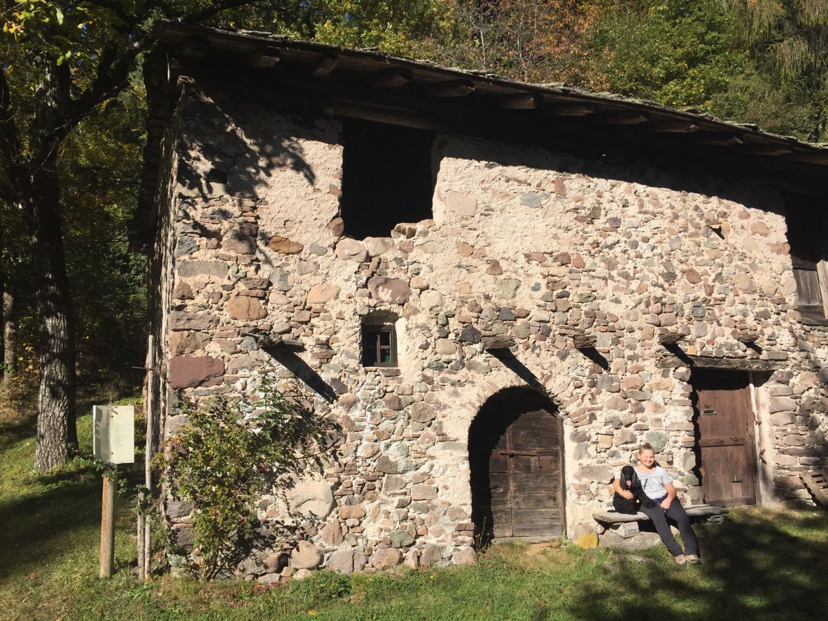 Un po’ dispiaciuti per i pochi resti di questa struttura che doveva sicuramente riservare un grande fascino per chi arrivava dal sentiero, scendiamo e decidiamo di prendere anche la stradina che porta al maso Purga. Ottima scelta: in pochi minuti arriviamo proprio ai piedi di questo affascinante posto, conservato benissimo e che, scopriamo, era il luogo di servizio del castello. Ci fermiamo davanti alla tabella che descrive gli utensili del tempo: la gerla, la falce e così via e proseguendo un poco più avanti, sulla stradina che ci riporterà a Poggio dei pini, troviamo una fontanella di acqua fresca e il “capitel de le Caore”. Proprio alla fontanella un cartello ci avvisa che da lì in poi il cavaliere non ci avrebbe più fatto da guida verso la strada del ritorno. Poco male, ormai il percoso ad anello è chiaro: per un tratto si percorre uno stradino asfaltato e poco dopo si ritorna al punto, nel bosco, in cui iniziava la salita per il castello.