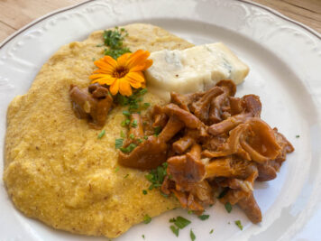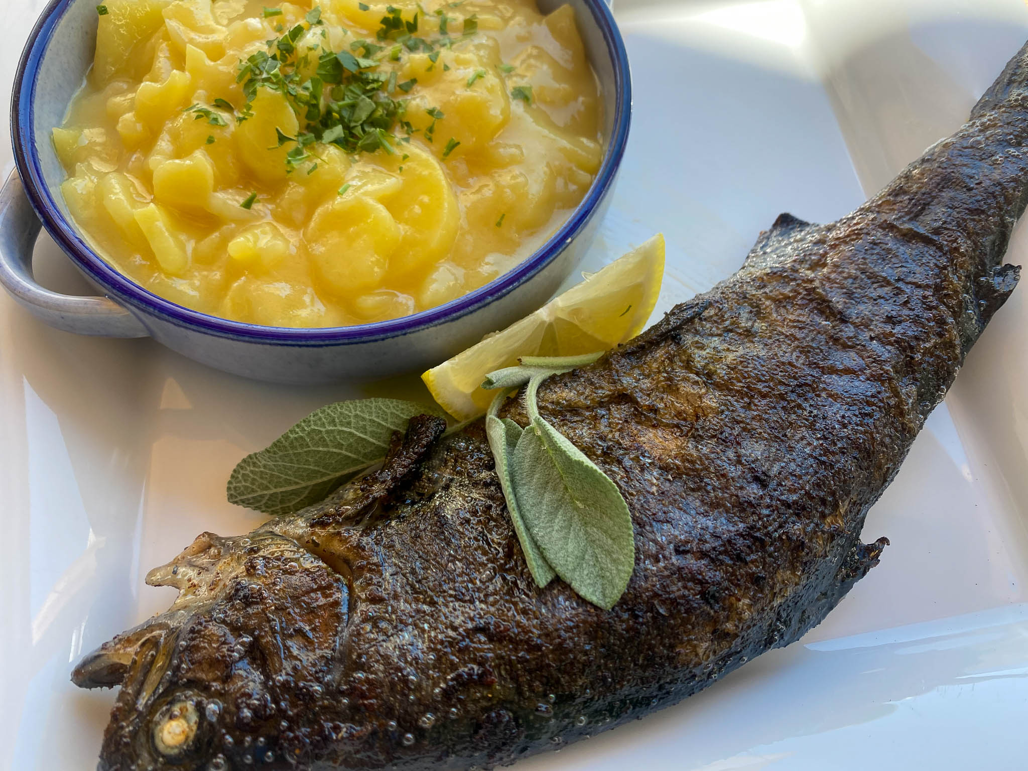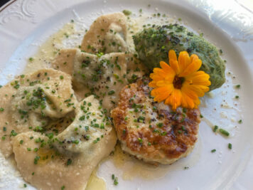 Il tempo di giocare un po’ ed ecco arrivati i piatti: polenta, fingerli freschi e gorgonzola; tris con canederlo pressato, ravioli ripieni di spinaci e formaggio e gnocchi verdi; trota appena pescata con insalata di patate.