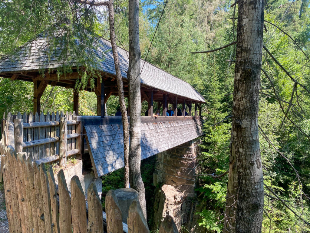 Quando arrivate al ponte coperto potete percorrerlo se non avete passeggini (ci sono scalette e radici), oppure proseguire dritti sulla strada che poi curva a destra. Questo percorso è consigliato se volete fermarvi a mangiare in un maso, altrimenti potete tornare sulla stessa strada dell’andata.