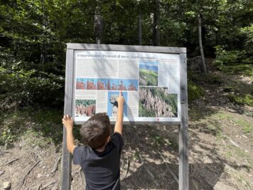 Dopo una mezz’ora circa eccoci arrivati alla strada sterrata che porta alle terrazze panoramiche che permettono di ammirare le piramidi. Dietro, le più belle cime dolomitiche ed un paesaggio idilliaco.