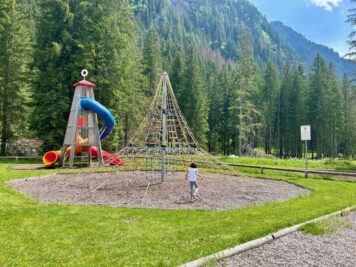 Poco più avanti trovate il parco giochi di Mazzin, più piccolo del precedente ma anch’esso molto bello! Scivoli, sabbiera, dondoli e altalene a ciambella, doppie e classiche.