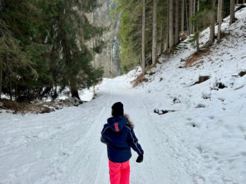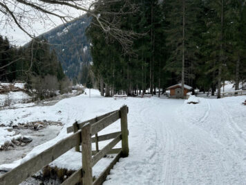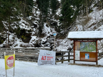 Attraversare questo ponte è un’emozione non da poco. Da lassù potrete ammirare la cascata del torrente Ragaiolo, distante solo pochi metri, e tutta la vallata sottostante. Soltanto in caso di troppa neve o ghiaccio l’accesso al ponte sospeso viene vietato, ma capita in rare occasioni. Anche in questo caso potete andare sul sicuro informandovi presso l’ufficio turistico. Una volta oltrepassato il ponte vi aspetta una breve discesa (attenzione: se c’è ghiaccio sono necessari i ramponi: ricordatevelo al momento della partenza). Noi vi suggeriamo poi di non seguire le indicazioni delle ciaspole (qui sotto) ma di prendere la strada forestale battuta, che sale più gradualmente.