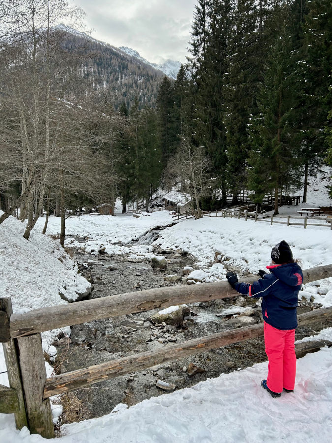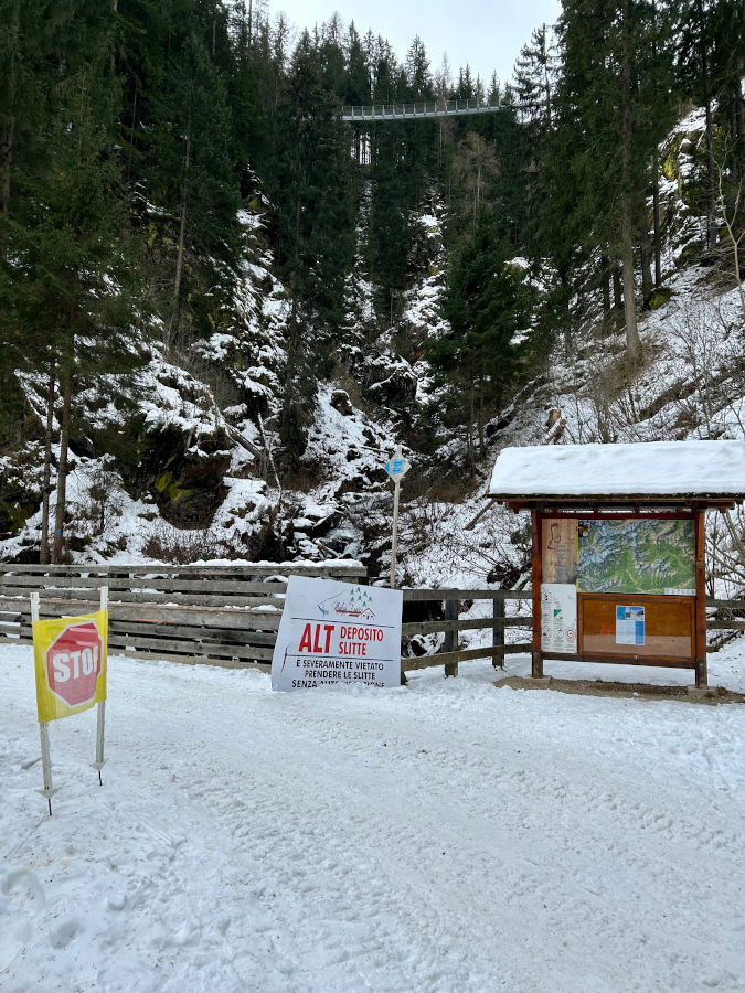 - se volete attraversare il ponte tibetano parcheggiate alle Terme di Rabbi, ma portate con voi i ramponcini per il ghiaccio: un’ora e mezza circa