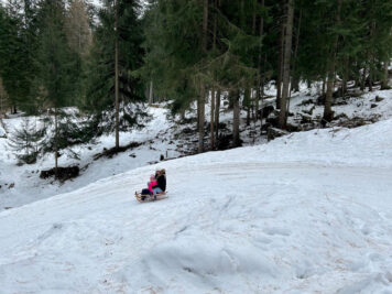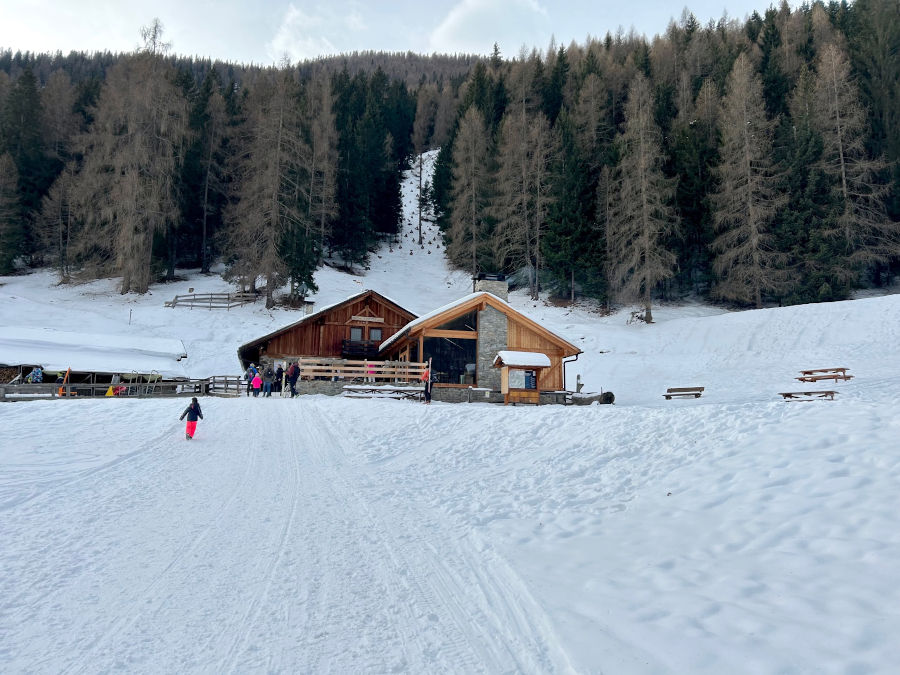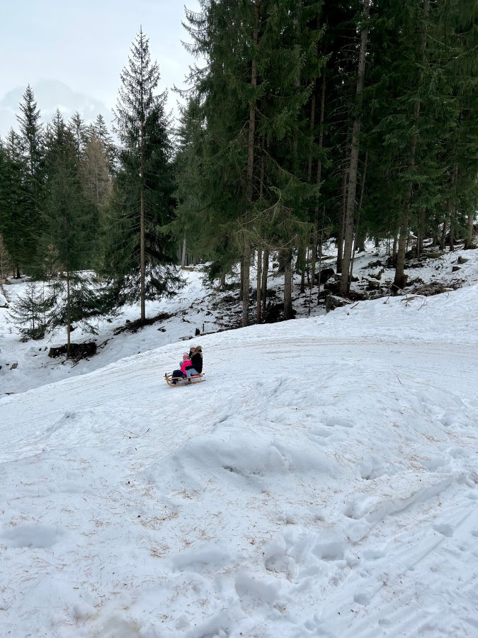 E ora, se la quantità di neve è sufficiente e lo permette, è tempo di tornare a valle in slitta! Lo slittino può essere noleggiato alla malga e vi permetterà di scivolare sui 4 chilometri di strada forestale fino alla località Plan, divertendovi e con poca fatica. Attenzione però: slittare è divertente, certo, ma è necessario che chi guida la slitta sia un po’ ferrato in materia: la discesa è infatti veloce e in certi punti potreste trovare un po’ di ghiaccio. Non fate assolutamente scendere i bambini da soli!